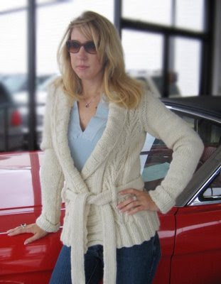 BEyaz örnekli kemerli uzun örgü hırka modeli