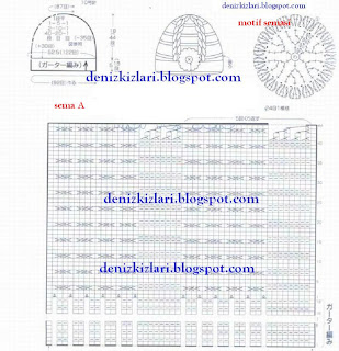 Daha sonra şapkaya şema A ya göre devam edilir. 40 sıra 17 cm ördüğümüzde şemadaki gibi 40ncı sırada 1 kez şemaya göre 20 ilmek eksiltiriz. Sonraki 2nci sırada 1 kez 10 ilmek eksiltip ~ daha sonraki sırada da 5 ilmek eksiltince ( toplam = 35 ilmek eksiltmiş olduk) son olarak şişimizde kalan 87 ilmeğide birden bitirip dikelim.