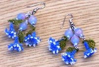Pembe mavi hareli üçlü boncuklardan yapılmış, ucu mavi-beyaz cimcime iğne oyalarıyla süslü küpe.