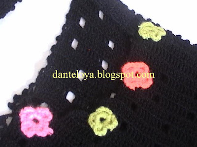 Yapılışı: Önce renkli çiçekleri ördüm daha sonra siyah iple kenarını döndüm iki sıra daha sonra krem rengi yeri örüp motifi tamamladım bu motifleri iğne ile diktim modelde görüldüğü gibi siyah iple bu motiflerin üzerine trabzan yaptım ve isteğe bağlı aralara kutucuk yaptım cep kısmında 8, 6,4 şeklinde kestim arka kısmı düz başlayıp boyu gelene kadar ördüm arka kısımda kesme yapılmadı bu iki parçayı tığ ile birleştirdim kenarını tığladım cep kısmındaki çiçekleri sonradan örüp diktim örgü örmeyi sevenleri rahatlıkla örebileceği bir model