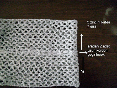 Öncelikle istediğiniz uzunlukta zincir çekiyorsunuz.(Benim atkı boyum 160 cm) Zincirin üzerini 5 zincirli kafeslerle örüyorsunuz.Ben toplam 7 sıra 5li zincir yaptım.İsteyen daha geniş veya dar hazırlayabilir.