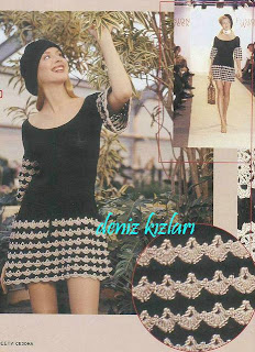 Bizim size vereceğimiz fikirle bu yazlık elbiseyi çok kolayca örmek mümkün. Siyah bir bulüzün kol ve etek kısımlarına şemasına göre ağ ipi yada ince merserize iplerle etek ve kol uzantısı örün.